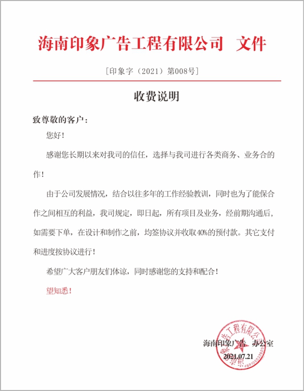 由于公司發(fā)展情況,結(jié)合以往多年工作經(jīng)驗教訓(xùn),同時也為了能保合作之間相互的利益,我司規(guī)定,即日起,所有項目及業(yè)務(wù),經(jīng)前期溝通后,如需要下單,在設(shè)計和制作之前,均簽協(xié)議并收取40%的預(yù)付款。其它支付和進度按協(xié)議進行!