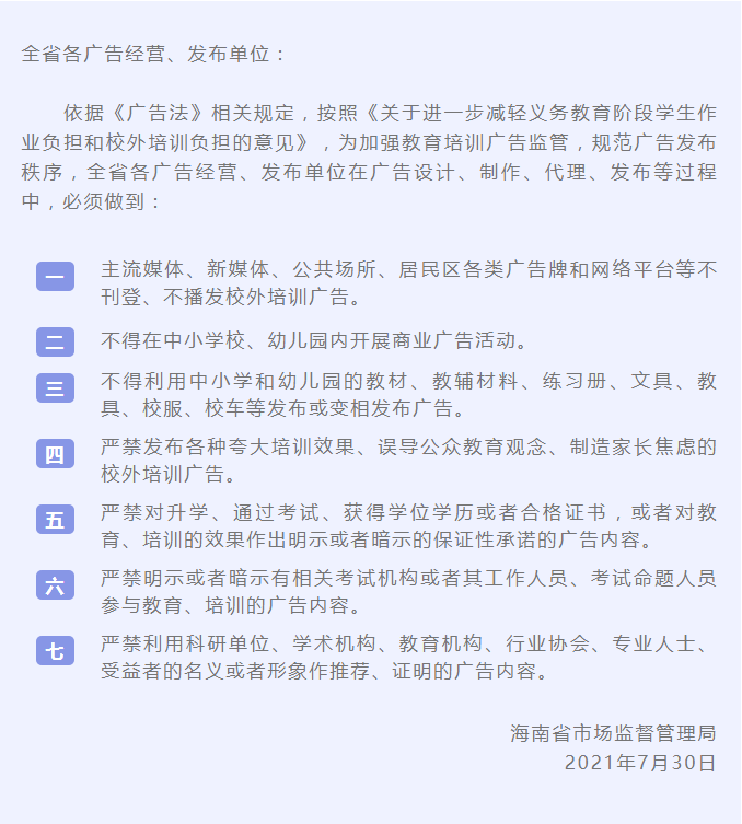 接海南省市場監(jiān)督管理局文,全省各廣告經營、發(fā)布單位應必須明確《廣告法》相關規(guī)定,切實落實《關于近一步減輕義務教育階段學生作業(yè)負擔和校外培訓負擔的意見》,堅決做到不設計、制作、代理及發(fā)布校外培訓廣告,在省市場監(jiān)管局的正確領導下合法經營。海南印象廣告配合市場監(jiān)督局的管理,落實執(zhí)行到位。 全文如下: