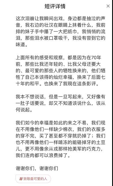 如今,時(shí)隔多年,我們?cè)?021年這個(gè)國(guó)慶,這場(chǎng)偉大的戰(zhàn)役,被拍成電影上映,這個(gè)國(guó)慶,觀影了的人都被深深地,深深地感動(dòng)了!