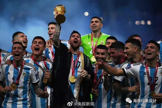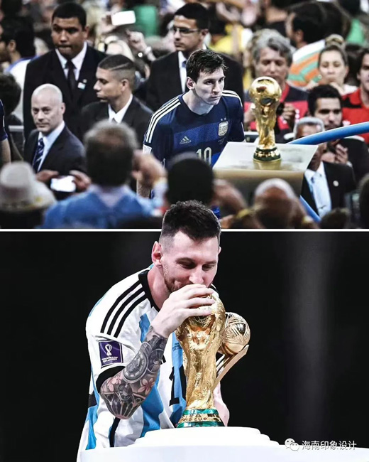 36年的等待終于在今朝落于實處,阿根廷球迷在盧賽爾體育場看臺上展示的馬拉多納大幅海報微微晃動,1986年阿根廷奪冠時的10號“看著”2022年身穿10號的梅西打入兩球,經(jīng)歷了加時賽與點球大戰(zhàn),再一次將“潘帕斯雄鷹”帶上世界之巔。在賽后個人獎項頒獎儀式上,梅西榮膺世界杯金球獎,并“提前”深情親吻了大力神杯。