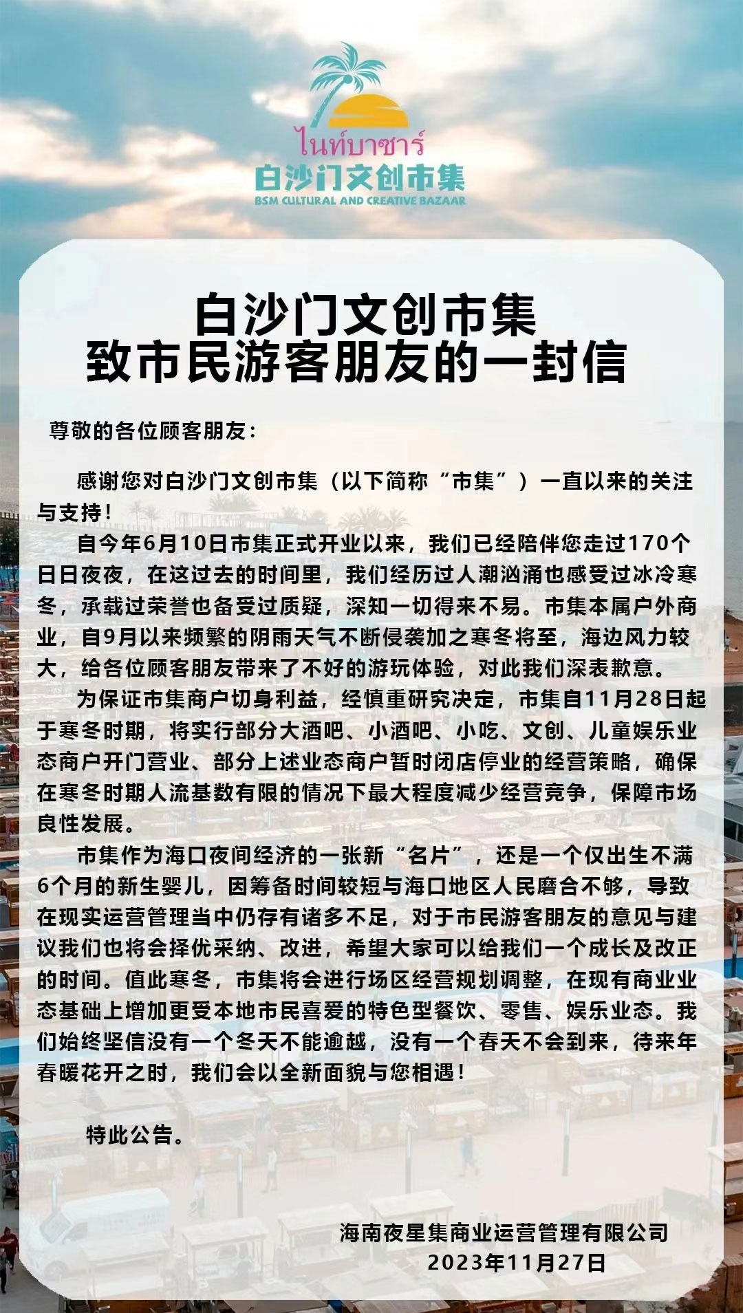灘夜市關(guān)市了,在眾多海南人不看好的情況下,亞洲最大的沙灘市集夜市——??诎咨抽T夜市,依然還是選擇開業(yè);但是由于地理位置偏遠(yuǎn),又是在海邊,晚上風(fēng)大又寒冷,顧客逐漸變少,直到今天開業(yè)半年左右選擇關(guān)市了;冬天來了,本該屬于海南人的煙火氣的夜宵生活,白沙門夜市選擇關(guān)市,只能說可惜了!