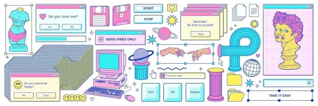 對于插圖和圖形,請考慮復(fù)古數(shù)字元素和全息貼紙,為社交媒體帖子賦予千禧年的氛圍。
