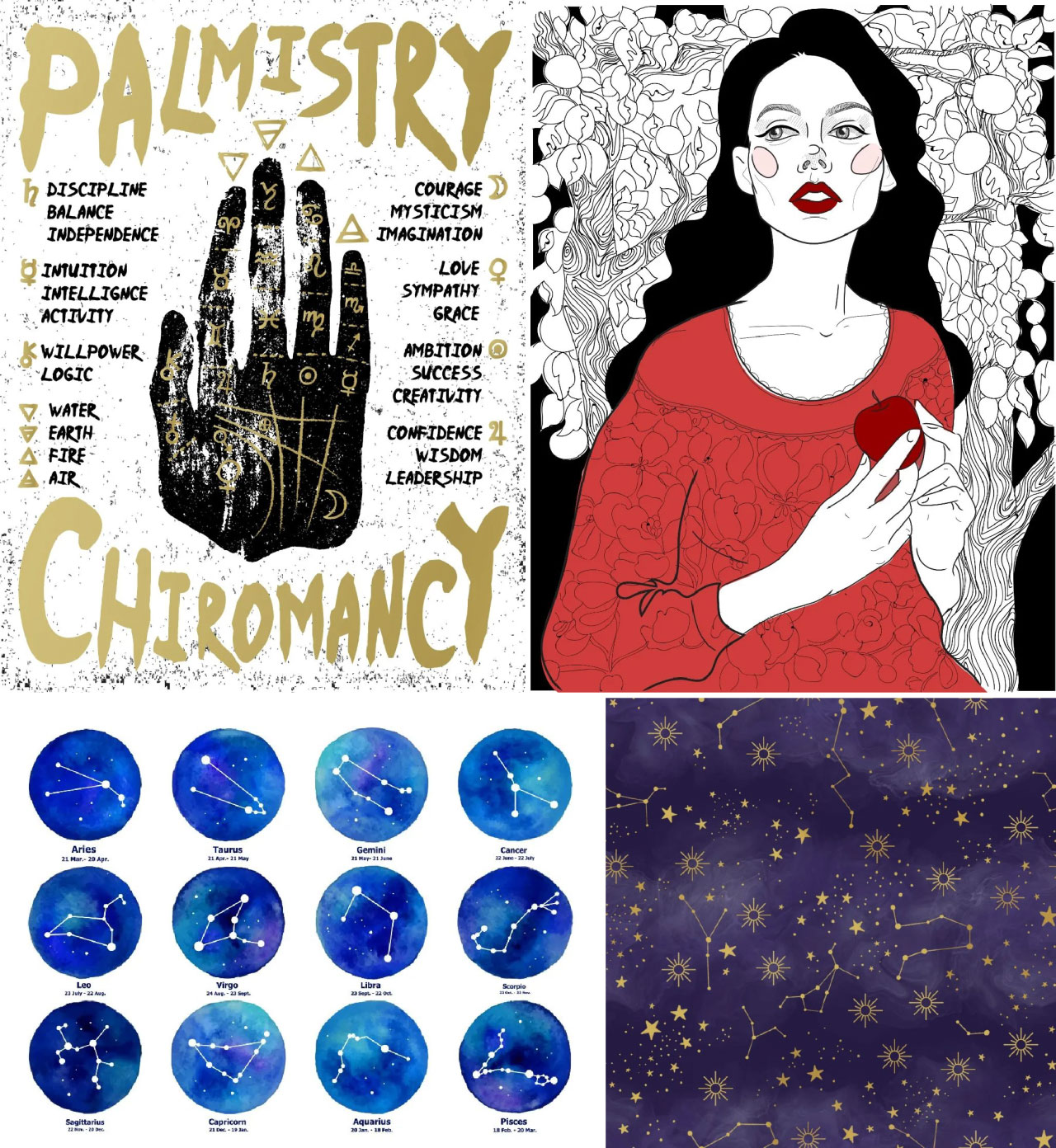 對于神秘設(shè)計的趨勢,您可以去用綜合材料創(chuàng)作有手工風(fēng)格的插圖,例如水彩紋理和凸版印刷風(fēng)格,以挖掘該趨勢的另類文化情緒。