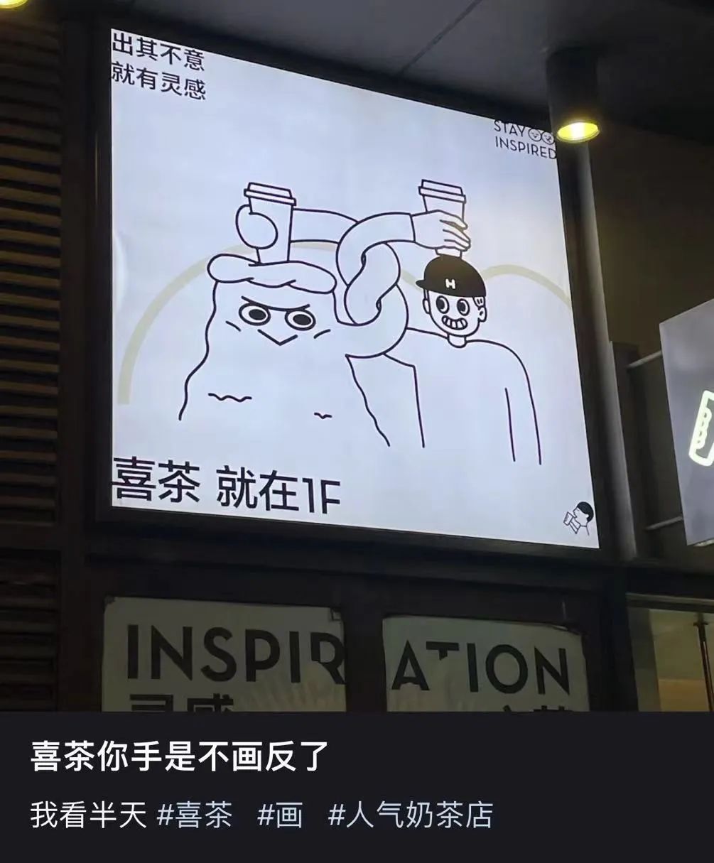 比如前段時間喜茶門店的宣傳海報