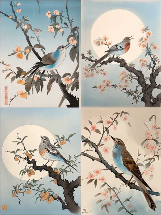 描述詞:畫(huà)眉鳥(niǎo)站在桂花樹(shù)枝頭上,天空是一輪滿月,有些許留白,