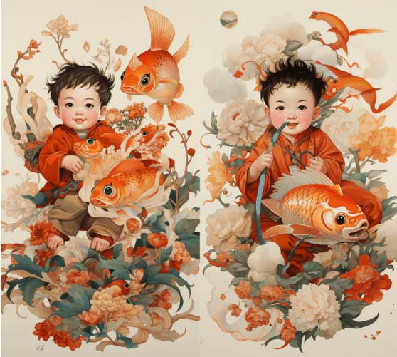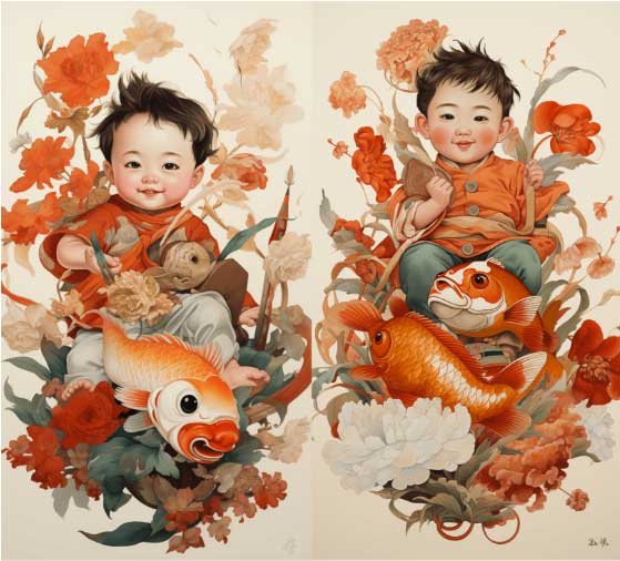 騎在錦鯉上,年畫(huà),國(guó)畫(huà)風(fēng)格,手繪,純色背景